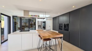 La cuisine haut de gamme, entièrement équipée, ouverte sur une salle à manger et salon. La grande baie vitrées à galandage offrent une ouverture sur la terrasse aménagée avec un salon de jardin, une table pour 10 personnes, deux parasols, une plancha à gaz et un barbecue.